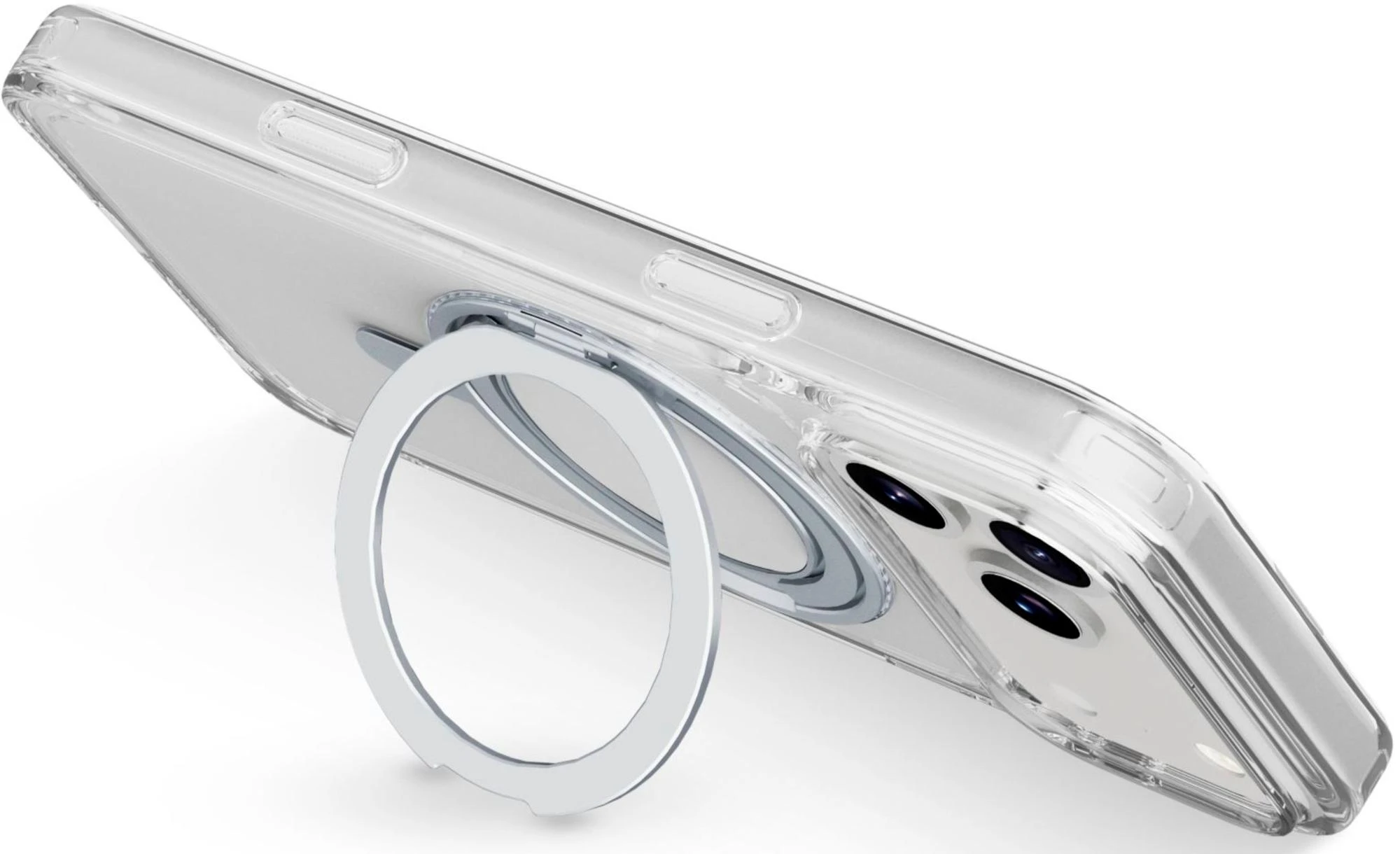 SPINMAG ist das transparente Etui mit drehbarem Standring, das mit dem MagSafe-Ökosystem vollständig kompatibel ist. Sein innovatives Design umfasst einen um 360° drehbaren Ring, der mehrere Funktionen bietet, wie z. B. die Möglichkeit, sich in einen Ständer oder Standfuß zu verwandeln. Der integrierte Ring wird zu einem festen Bestandteil des Gehäuses, wenn es nicht benutzt wird, und ist somit vollständig mit MagSafe-Zubehör kompatibel. Die erhöhten Ränder um das Display und die Kamera bieten zusätzlichen Schutz vor versehentlichen Stößen und Stürzen.